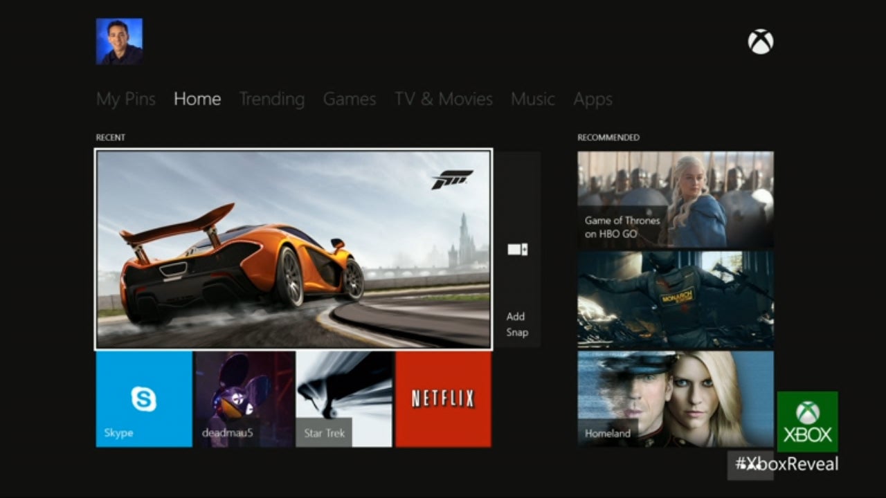 Im Grunde will Microsoft, dass ihr ein "Verhältnis" zu eurem Fernseher aufbaut. Und in dieser Hinsicht verfügt Xbox One über eine Verbindung, die keine andere Konsole hat, einen HDMI-Eingang (unterstützt 1080p, 3D, sogar 4K - mindestens die 30Hz-Version dessen wird in HDMI 1.4a unterstützt). Die Idee dahinter ist, dass ihr eure existierende Set-Top-Box an die neue Konsole anschließt und nahtlos zwischen Fernsehen und Gameplay umschaltet - und sogar Apps gleichzeitig zu beiden laufen lasst. Ihr spielt zum Beispiel Forza 5, wechselt rüber zur Formel 1 und nehmt gleichzeitig einen Skype-Anruf an. Indem ihr Kinects Stimmsteuerung nutzt, könnt ihr sogar Funktionen kontrollieren, für die man normalerweise eine separate Fernbedienung benötigte, um etwa einen Kanal auszuwählen. Und es wird ja nicht nur Fernsehen unterstützt: Filme, Musik und Internet sind ebenfalls verfügbar, allesamt unterstützt durch die Vision der nahtlosen Integration.