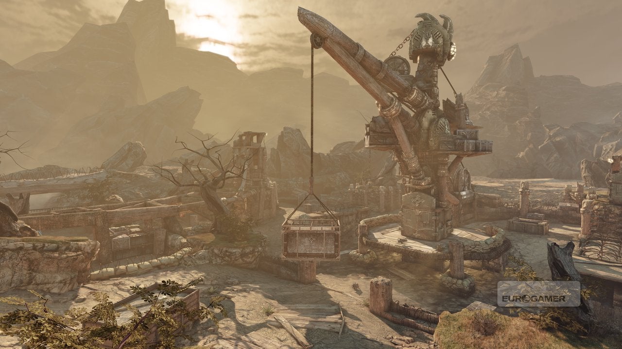 Einerseits hätten wir da natürlich Waffen, Granaten oder auch Munition. Die Schießeisen liegen üblicherweise auf den Schlachtfeldern herum, also stellt ihr euch einfach daneben und haltet kurz den Y-Button gedrückt, um das gute Stück zu erwerben. Mit dabei ist alles, was man so aus dem Gears-Arsenal kennt, etwa der Boomshot, der Torque Bow oder der Hammer of Dawn.